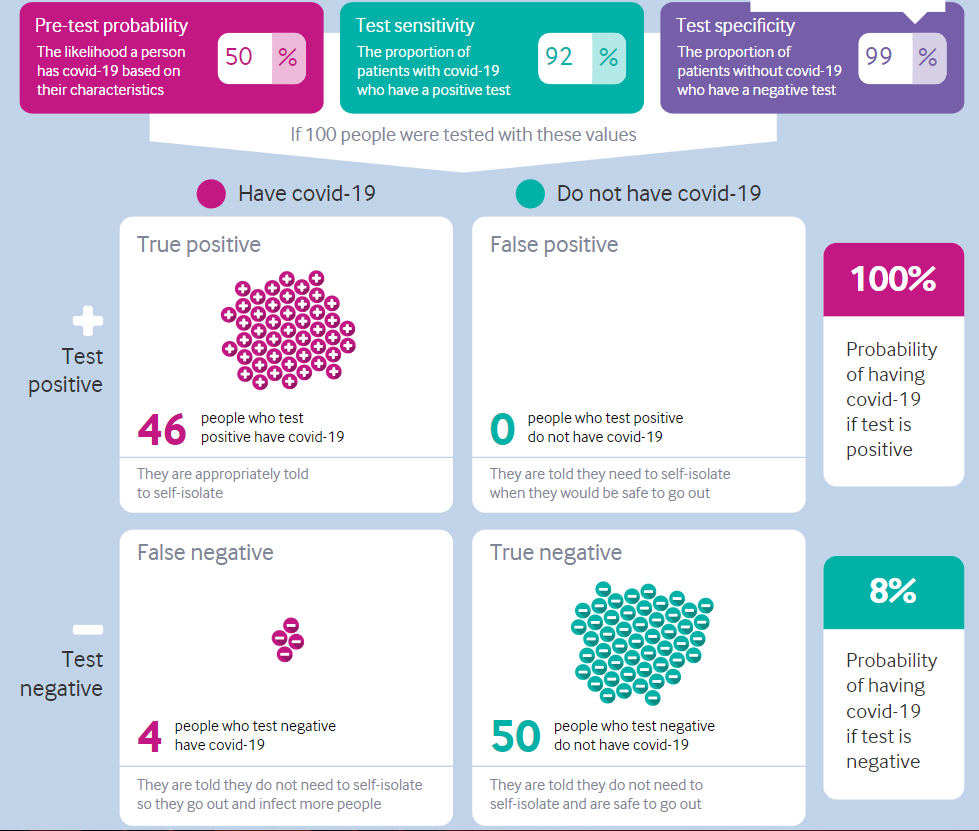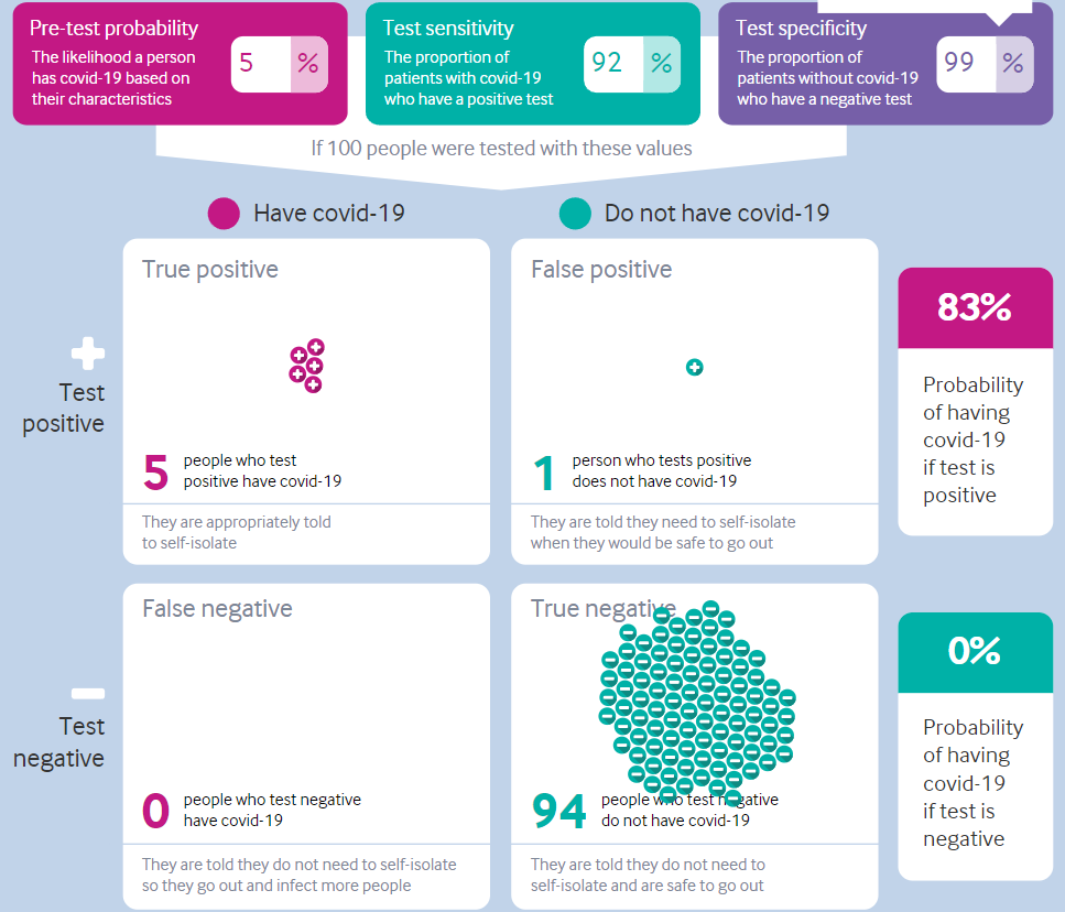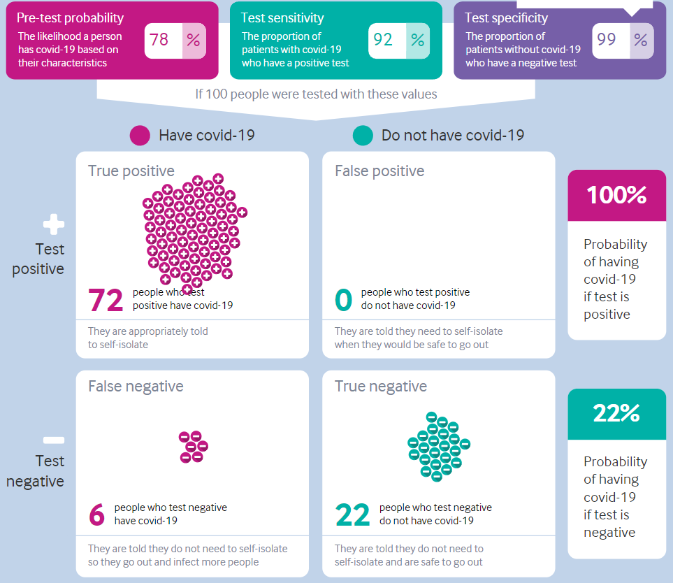 Indeed not, for we can play with a handy calculator provided by the BMJ which may be found here (providing we have some sensible numbers to stick in). Experts at the ONS tell us that PCR test sensitivity is “somewhere between 85% and 98%”, with specificity quoted as “ very close to 100%”. Let us split the difference and go for a sensitivity of 92%, and use 99% for specificity, being the sensible types that we are. We now need a jolly decent estimate of disease prevalence (a.k.a. pre-test probability) for care homes in England & Wales. In a splendid IJE article which may be found here we find that “one in 20 long-term care facilities (LTCF) residents have been infected with COVID-19”; this gives us a pre-test probability of 5%. Turning the handle on the BMJ calculator I get this…